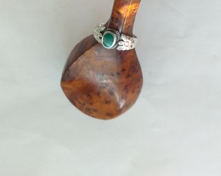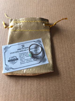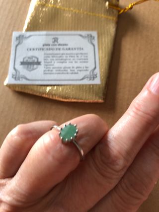 Plata muy sólida y fuerte sujetando bien la esmeralda . Esta nueva completamente es una talla 13- 13,5, a mi no me pasa al final del dedo