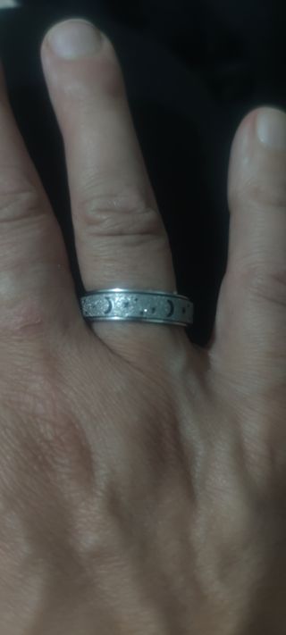 Anillo brillante en plateado con grabados de lunas y estrellas ... Son estrenar..la talla está entre 8 y 9...giratorio para jugar con el...