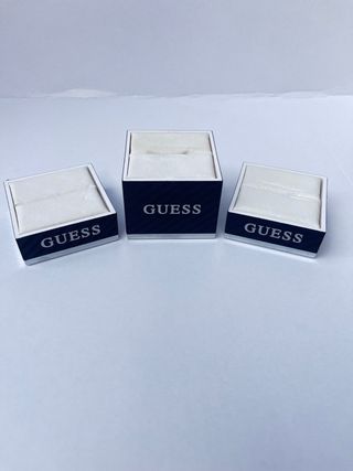 Set de expositores para anillos de la marca Guess. Presentan un diseño elegante con detalles en negro y plateado. - Diseño con acabado tipo fibra de carbono. - Logotipo de Guess visible. Más artículos en mi perfil