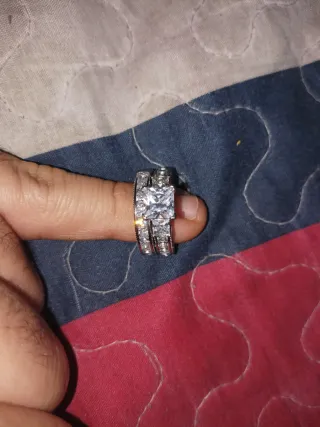 Conjunto de dos anillos, uno de color negro con un pequeño diamante y otro plateado con incrustaciones. - Anillo negro con un diamante. - Anillo plateado con varias piedras.he puesto un anillo a lado esa es la talla 22 son súper grandes pongo foto mia para que veáis mi tamaño,son para dedos bastante gordos