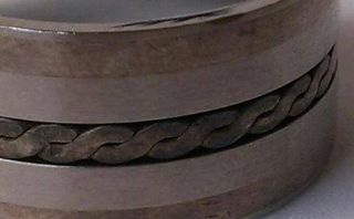 Anillo de plata 925 con un diseño detallado y texturizado. - Banda con múltiples líneas. - Sección central con patrón trenzado. -Macizo. -Talla aproximada. ver fotografías. -Si se pule se queda como nuevo.