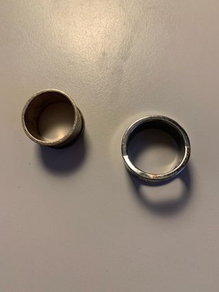 Conjunto de dos anillos de diseño ancho. Uno de ellos lleva muesca para abrir botellas con cierre con chapa. - Color plateado. - Estilo moderno.