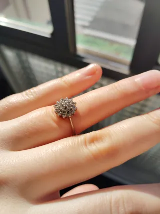 Elegante anillo de plata con un diseño floral adornado con pequeñas circonitas. Sin marca. Desconozco la talla. - Material: Plata. - Diseño: Floral con circonitas.