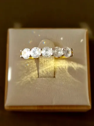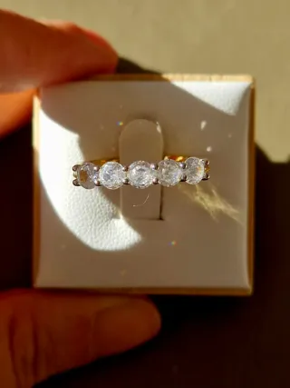 Elegante anillo con un diseño clásico y atemporal. Perfecto para añadir un toque de brillo a cualquier ocasión. - Montura de plata esterlina. - Cinco circonitas engastadas. - nunero 7, diámetro 15,2mm