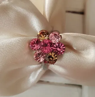 Anillo con un diseño floral adornado con cristales. Nuevo a estrenar. Ajustable. 17,8 mm diámetro - Diseño de flor con múltiples pétalos. - Cristales en tonos rosas y dorados. - Montura plateada.