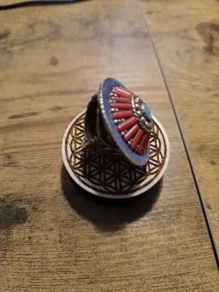 Anillo de estilo tibetano con un diseño circular. Ajustable y unisex - Detalle central en turquesa. - Adornado con pequeñas piezas de coral o material similar en tono rojizo. - Borde con un diseño trenzado y detalles plateados. Plata tibetana con incrustaciones de coral y lapislázuli. Joya elegante que no pasa desapercibida. Joya# amuleto # tibetano # anillo protector # regalo#