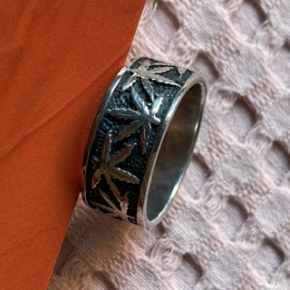 Anillo con un diseño detallado de hojas en relieve. Su acabado combina tonos plateados y oscuros para resaltar el patrón. - Diseño de hojas de marihuana -Macizo. -Talla aproximada. Ver medidas en las fotos.