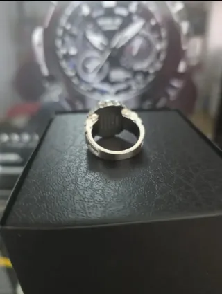 Anillo de plata con un diseño llamativo y una piedra central. - Piedra de color negro. - Detalles plateados en el aro.