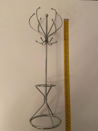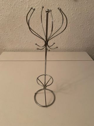 Organizador de metal plateado para exhibir y guardar tus accesorios. - Diseño con múltiples ganchos. - Base circular estable. - De unos 40 cms de altura
