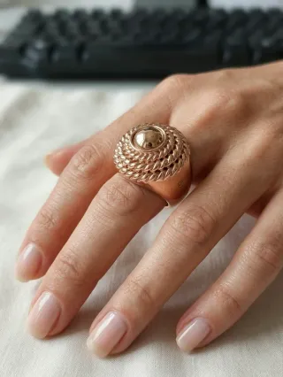 Añade un toque de alta costura con este espectacular anillo de la icónica firma Pertegaz. Una pieza con una presencia visual imponente, diseñada para quienes no temen destacar. Tiene un diseño voluminoso de inspiración vintage que combina la sofisticación clásica con un toque moderno. Está bañado en un exquisito oro rosa con acabado pulido espejo que capta la luz desde cualquier ángulo. Eleva cualquier look, desde un vestido de noche hasta un conjunto de blazer y jeans. Lleva el sello de elegancia y distinción que siempre ha caracterizado a la casa Pertegaz