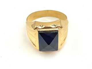 ES DE NIÑO,TALLA PEQUEÑA. Anillo Acero Quirúrgico Chapado Oro Piedra Zafiro Azul ¡Gran oportunidad! Elegante y llamativo anillo de sello para hombre. Fabricado en resistente acero quirúrgico de alta calidad (316L) con un lujoso chapado en oro de 18 quilates. Características principales: Material premium: Acero inoxidable que no se oxida, oscurece ni produce alergias (hipoalergénico). Diseño sofisticado: Cuenta con una llamativa piedra central cuadrada de color azul intenso (tipo zafiro) y detalles decorativos con patrón griego en la banda. Duradero: Mantiene su brillo por mucho tiempo.