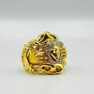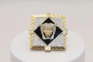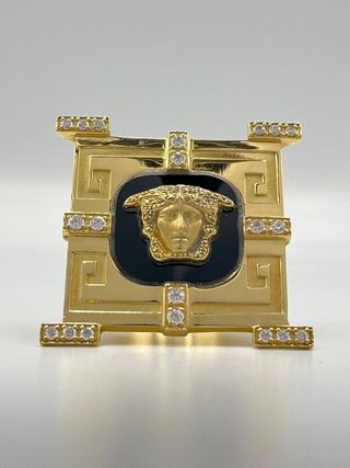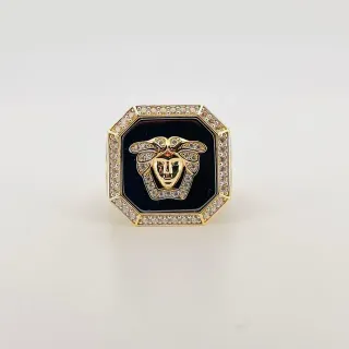 Precioso anillo de hombre con diseño Versace. Está elaborado en oro de 18 quilates y presenta un acabado dorado brillante. El anillo tiene un diseño cuadrado con la icónica Medusa de Versace en el centro, sobre un fondo negro. Luce impecable. - Diseño cuadrado con la Medusa de Versace. - Elegante y llamativo. - Ideal para un regalo. Peso 15,30 gramos Cash Converters Av. Novelda 7
