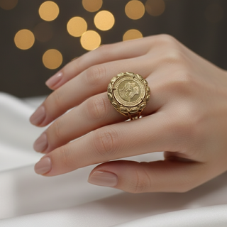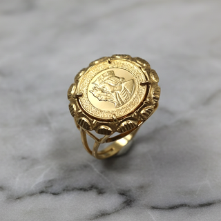 Anillo sello de oro amarillo de 18K, una joya con historia y un diseño único. El cabezal, de 17.90 mm de ancho, luce una detallada reproducción de una moneda conmemorativa de los Reyes Católicos, rindiendo homenaje a un periodo emblemático. Con un peso de 3.82 gramos y una talla N.º 20, esta pieza combina la elegancia atemporal con un significado histórico. Este anillo es un tesoro que destaca por su calidad y su encanto. B01586144 Puedes contactarnos por whatsapp al 659 916 294 o visitar nuestra web joyeriatynel.com para ver más opciones. Te ofrecemos facilidades de pago, envío seguro y gratuito, y devolución en 14 días. Además, t