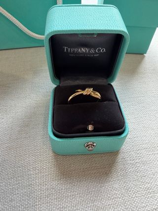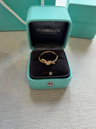 Anillo Tiffany Knot (nuevo sin estrenar): -Material: Oro amarillo de 18 quilates -Talla: 6 (Tiffany); 12 (España); 16.5 (Diámetro) -Incluye ticket de compra, precinto y caja original -Incluye el sello de Tiffany & Co. -Comprado el 11 de abril de 2025 y desde ese día no se ha estrenado ni movido de su caja original (ticket adjunto en imágenes) -Actualmente en la web tiene un costo de 1.500€ debido a la revalorización del oro