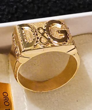 Anillo de Oro de Primera Ley (18K) tipo sello con iniciales DG. Nuevo a estrenar. 21 - 21,7 mm diámetros interiores, 10,3 g.