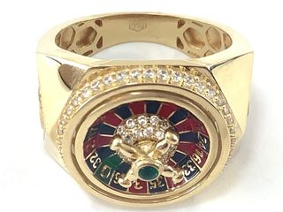 Anillo tipo sello con un diseño llamativo. - Acabado en tono dorado. - Detalle de brillantes alrededor del diseño central. - Diseño central con forma de herradura y cabeza de caballo. Le falta un brillante como se aprecia en la última foto, de ahí su precio (de puede poner uno en joyería sin mucho valor). Precio negociable.