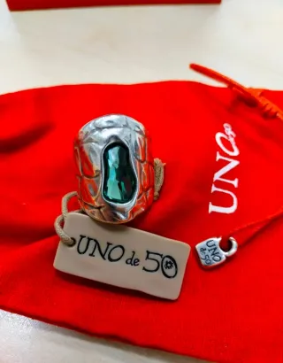Anillo Unode50 modelo Confessions. Anillo con baño de plata. Anillo ancho tipo tubo, con baño de plata de 15 micras y cristal Swarovski central en color verde tornasolado y grabado de piel de cocodrilo. Elaborado a mano en España por Unode50 de manera 100% artesanal. Talla L (medida diámetro interior 17'5mm). Mide de ancho (parte más ancha 30 mm). SIN ESTRENAR CON ETIQUETA, certificado de autenticidad, bolsita original y paño de limpieza. Precio de venta original 95€. Anillo original, moderno e imponente. No se aceptan devoluciones