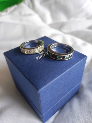 Elegante conjunto de dos anillos de la marca Swarovski. El anillo superior presenta cristales en tonos azules y el inferior cristales transparentes, ambos engastados en metal plateado. Entrega en mano en Valencia - Ancho de los anillos: 15 mm.
