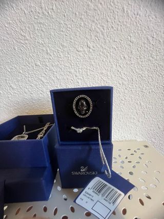 Elegante anillo de la marca Swarovski. - Diseño circular con detalles en negro y plateado. - Centro con una pequeña gema o cristal.