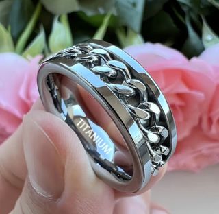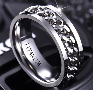 Anillo de acero de titanio con un diseño de cadena. Material: Acero de titanio. Tallas disponibles: 9, 10, 11, 12.