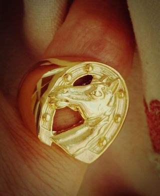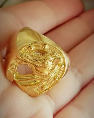 Anillo chapado en oro 18k con diseño de herradura y cabeza de caballo. Talla 23. Disponible en distintas tallas. Es una pieza elegante y llamativa. El metal interno es titanio cubierto por micras de oro 18k. - Diseño: joyería artesanal hecho a mano de estilo clásico y masculino. Anillo de oro 18k sobre titanio. Nuevo a estrenar. Se envia con cajita y etiqueta.