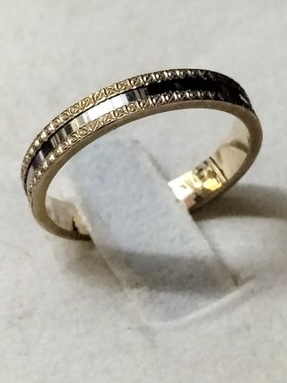 Elegante anillo de oro amarillo y titanio de 9 quilates. Es una pieza delicada y vistosa. - Diseño bicolor en oro de 9 quilates. - Acabado pulido brillante. No vendo al peso. No acepto devolución.
