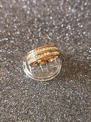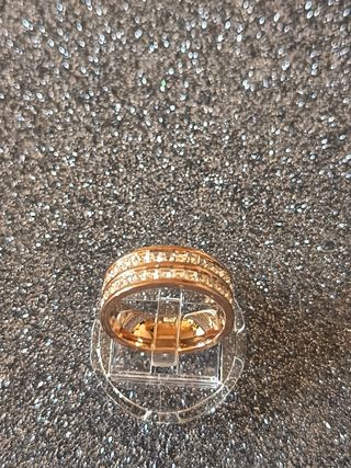 Nuevo. Talla 17. Ancho: 12 mm. Elegante anillo de acero titanio con baño de oro y adornado con circonitas brillantes. - Acabado texturizado. - Presentado en cajita. NO hago cambios ni envíos, recoger por mi zona.