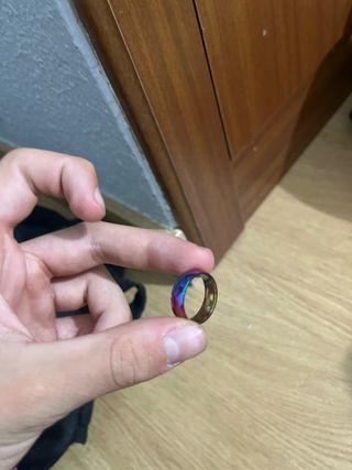 Anillo de acero de titanio con un acabado iridiscente que refleja múltiples tonalidades. - Material: Acero de titanio. - Diseño: Acabado multicolor.