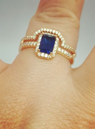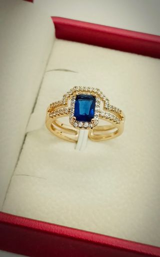 Anillo laminado en oro de 18 quilates, con un llamativo zafiro de laboratorio de color azul marino. -El metal interno es titanio cubierto por 30 micras de oro 18k. -Talla ajustable se abre y cierra a la medida deseada. - Piedra central de zafiro sintético. - Detalles de circonitas cúbicas alrededor. Joyería artesanal hecho a mano. Nuevo a estrenar con cajita y etiqueta.