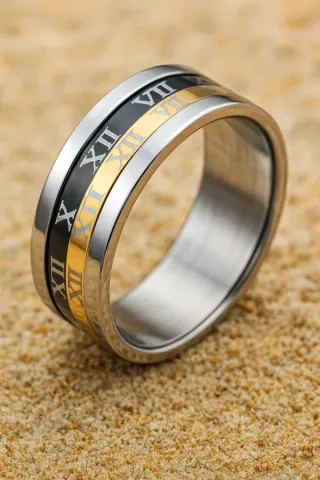 Elegante anillo con un diseño moderno y sofisticado. - Banda central con acabado en negro y detalles dorados. - Grabado de números romanos. - Tungsteno y Titanio.