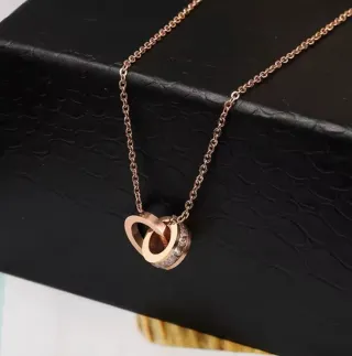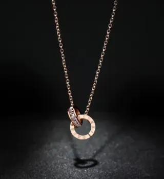 Elegante collar con dos anillas entrelazadas, una de ellas adornada con pequeñas gemas y la otra con números romanos. - Diseño moderno y sofisticado. - Acabado en tono dorado. - Material acero de titanio.