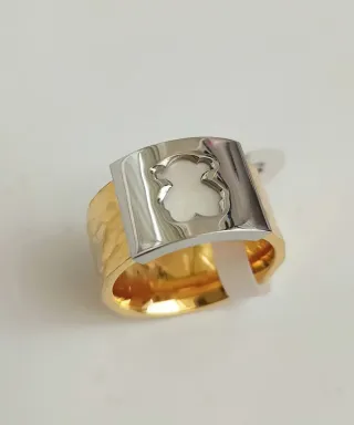 Nuevo. Talla 17. Ancho: 10 mm. Anillo con un diseño bicolor de acero titanio con baño de oro. - Diseño con acabado amartillado en la banda dorada. - Detalle central con forma de oso de nácar - Presentado en cajita. NO hago cambios ni envíos, recoger por mi zona.