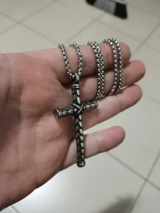 Colgante de cruz con un diseño labrado y detallado. - Material: Acero titanio 316L - Color: Plateado. - Diseño intrincado y robusto. Anillos leones talla 10 acero titanio 316L.
