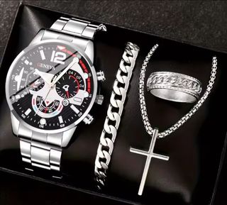 Conjunto de bisutería que incluye un reloj Geneva, un collar con Cruz, una pulsera y un anillo debido a fin de stock de una joyería. La primera foto es de la foto comercial de la joyería y el resto de fotos están realizada en casa con cámara de móvil. Todo es de titanio y el reloj es de titanio y cuarzo. Preguntar si se quiere vender por separado.