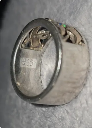 Anillo antiguo de la marca Tous con diseño de plata 925. Presenta detalles de figuras y pequeñas incrustaciones de gemas de colores. - Material: Plata de ley 925, bañado en oro. - Diseño: Figuras y gemas multicolor.