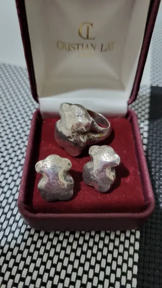 Conjunto de joyería de plata de la marca Tous. - Incluye anillo y pendientes. - Diseño único y moderno.