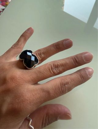 Anillo de la marca Tous con piedra de onix negro y detalles en plata. - Diseño llamativo con piedra facetada. - Montura de plata. - Estilo moderno y elegante.