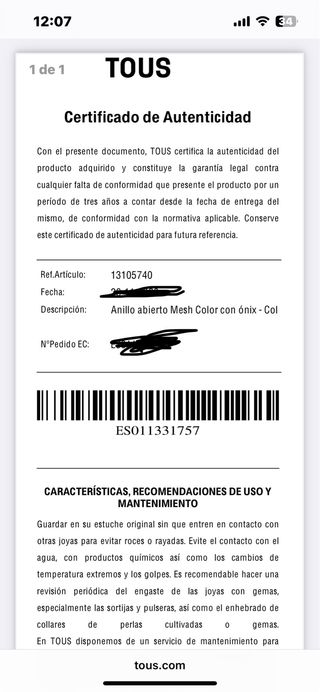 anillo plata TOUS si uso con su caja la medida es 17,5 milímetros interio No hago envios