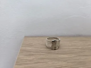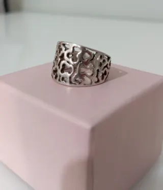 Anillo original de Tous en plata de ley 925, con diseño formado por múltiples ositos en relieve alrededor de toda la pieza. Es un modelo muy buscado y versátil, perfecto para llevar a diario o para completar cualquier look especial. El interior del anillo lleva el sello oficial de Tous, visible en las fotos. No se dispone del recibo de compra. La autenticidad queda garantizada por el marcaje original. Está en perfecto estado y con muy poco uso. Medida interior: 16,8 mm (equivalente aproximado a una talla 13-14 española). Si necesitas más Si necesitas más fotos, medidas o ver cómo queda puesto, puedo enviarlas sin problema!