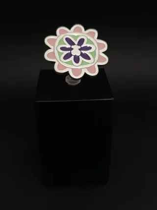 Anillo de plata con detalles en blanco, en perfecto estado. - Diseño floral. - Centro circular. - Motivos en forma de pétalo.