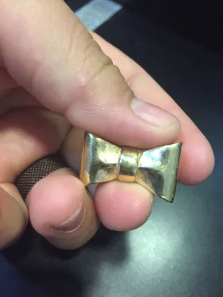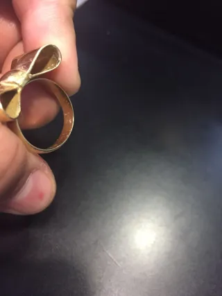 Este es un anillo con forma de lazo, con un acabado de oro brillante. - Diseño de lazo. - Acabado de oro Descatalogado