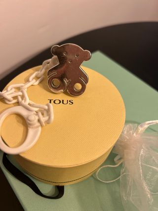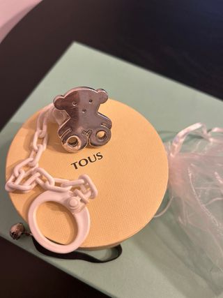 Chupetero de la marca Tous con diseño de oso. - Plata. - Cadena blanca. - Anillo blanco.