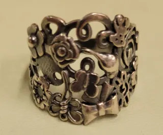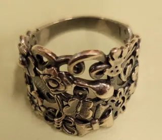 Anillo de plata TOUS con un diseño delicado y detallado. -Talla anillo 23 - Motivos de flores y mariposas. - Acabado en plata oxidada.