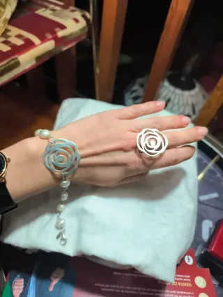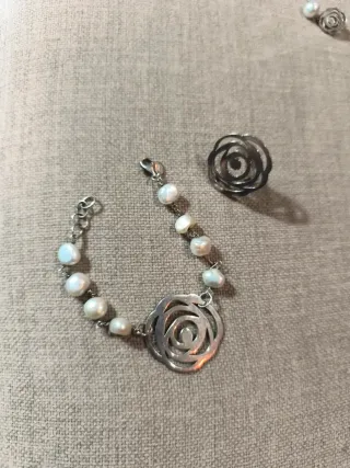 Elegante conjunto de pulsera y anillo de la marca Tous. - Pulsera con perlas de agua dulce y detalle de flor. - Anillo a juego con diseño de flor. - Piezas de plata.