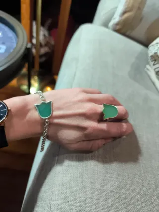 Conjunto de pulsera y anillo con diseño de tulipán verde colección Rainbow Tulipán Verde de Tous. - Pulsera con cadena plateada. - Anillo ajustable con detalle de tulipán.