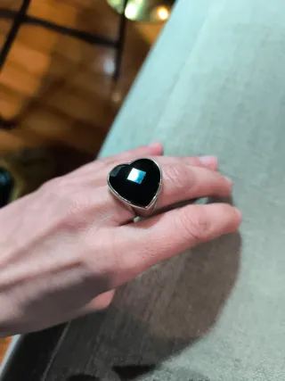Elegante anillo de la marca Tous con un diseño de corazón. - Piedra central de color negro. - Engaste en plata.
