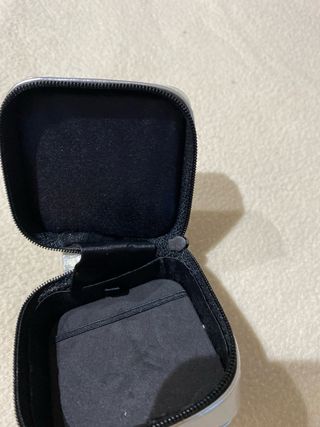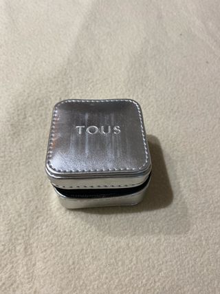 Elegante caja de la marca Tous, perfecta para guardar tus anillos. - Diseño cuadrado y compacto. - Acabado exterior plateado brillante. - Cierre de cremallera.