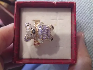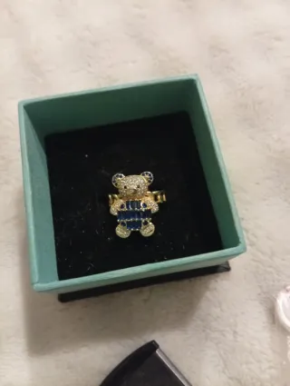 Anillo con forma de oso en color burdeos. - Diseño icónico de la marca. - Detalle metálico en el centro. - Está un poco aplanado, pero se puede ajustar. - Talla aproximada: 14. - Vendo también los pendientes y colgante a juego.