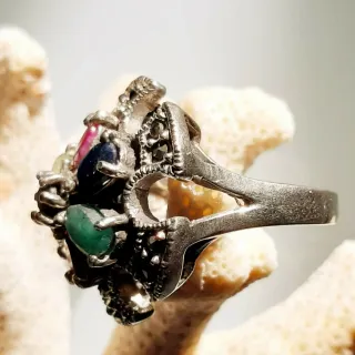 Precioso anillo vintage, hecho en plata de primera ley. Incrustaciones de piedras preciosas, marquesitas y zafiros. El artículo que se envia es el de las fotos 10% De descuento por la compra de dos artículos o más. ⚠️Solo se hacen envíos ⚠️