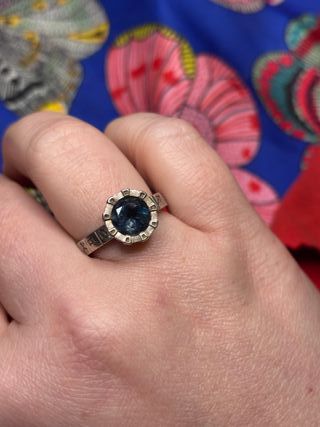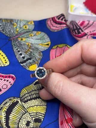 Anillo con diseño inspirado en Stargate, engastado con un zafiro Blue London. En el costado por la parte de abajo tiene un diamante. Fue diseñado para mí y costo 690€ - Material: Plata. - Piedra: Zafiro Blue London.